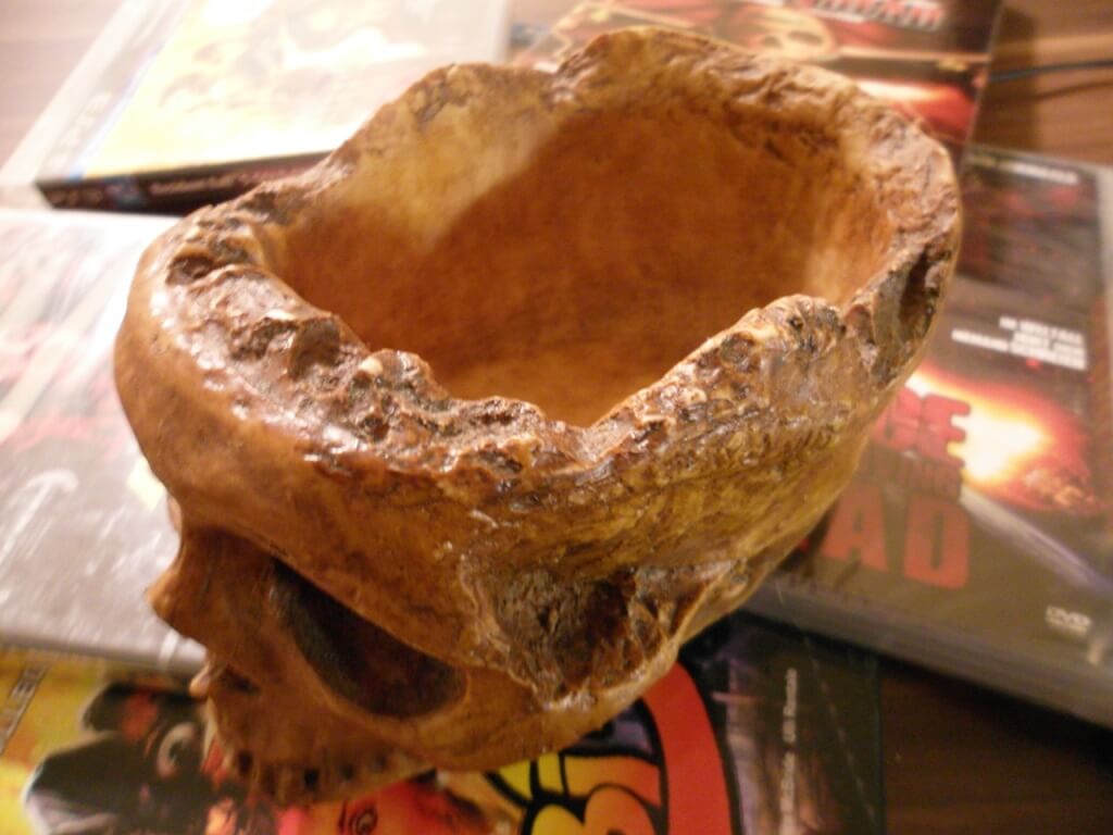 Der Schädel ist schon wirklich wunderschön gestalltet, sieht aus wie gerade aus dem Tempel geholt. Jedoch saß dieser wohl auf einem Schrumpfkopfkörper, denn der Schädel misst gerade mal: 15cm x 12cm x 8cm. Aber diesem Grund ist er aber auch einfach zu transportieren. Er wiegt fast einen Kilo und verleiht ihm einen stabilen und hochwertigen Eindruck. Der Schädel hat oberhalb eine Auskerbung (als wär das Hirn rausgefallen 😉 ), hier lassen sich prima Schrauben, Kugelschreiber, Radiergummis, USB-Sticks und vieles mehr verstauen. Ich lege hier meistens meine Schrauben rein wenn ich mal wieder einen Computer zum Leben erwecken muss und die kleinen Schrauben beisammen habe. Aber auch als Aschenbecher dient der Schädel ebenfalls, denn die Auskerbungen zum Zigarrette ablegen sind vorhanden und gerade dass unterscheidet ihn von herkömmlichen, hässlichen, grauen USB Hubs.